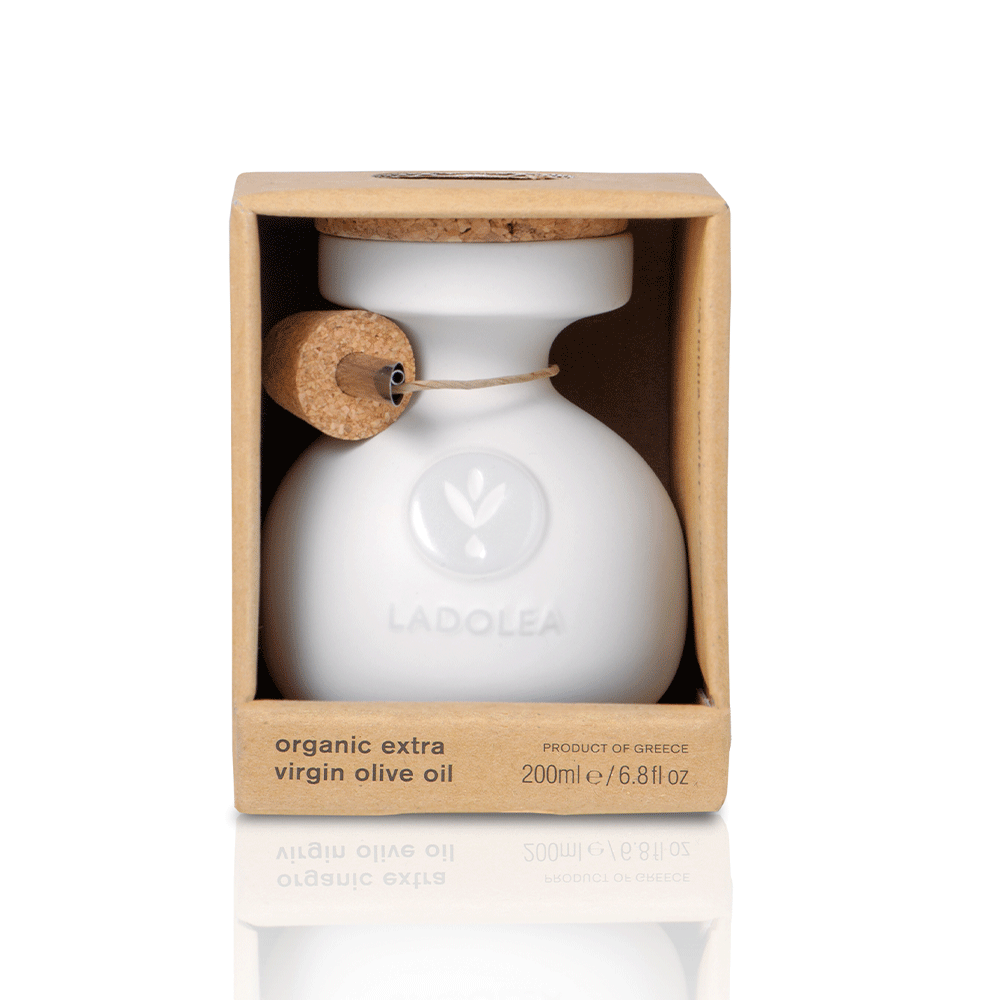Φροντίζοντας για τους καταναλωτές μας και το περιβάλλον, κάθε επαναχρησιμοποιήσιμη κεραμική συσκευασία συνοδεύεται από ένα πώμα ροής, ώστε να μπορεί να επαναγεμιστεί από τις ανακυκλώσιμες μεταλλικές συσκευασίες LADOLEA.